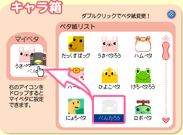 「マイペタ」は、変えることができます。 ペタ紙の顔のあたりを右クリックして、「キャラを選ぶ」を選び、キャラ箱を起動します。 ペタ紙リスト(キャラクター一覧)から、いちばんよく使うキャラクターのアイコンを「マイペタ」のアイコンの上へドロップします。 これで、「マイペタ」が変更されます。